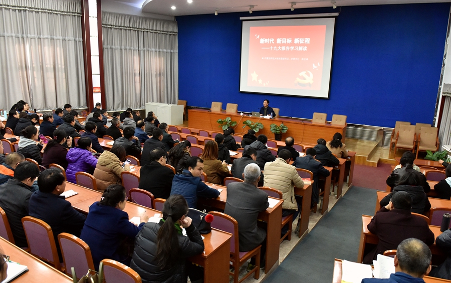 11月15日,校党委副书记、纪委书记高云峰应邀为beat365党政机关党总支、教育科学学院党总支、公共管理学院党总支、beat365正版唯一官方网站党总支、后勤机关党总支、盛乐后勤服务集团党总支等六个党总支作了题为《新时代 新目标 新征程——党的十九大报告学习解读》的报告,beat365由张裕凤党总支副书记(主持工作)出席了本次报告。