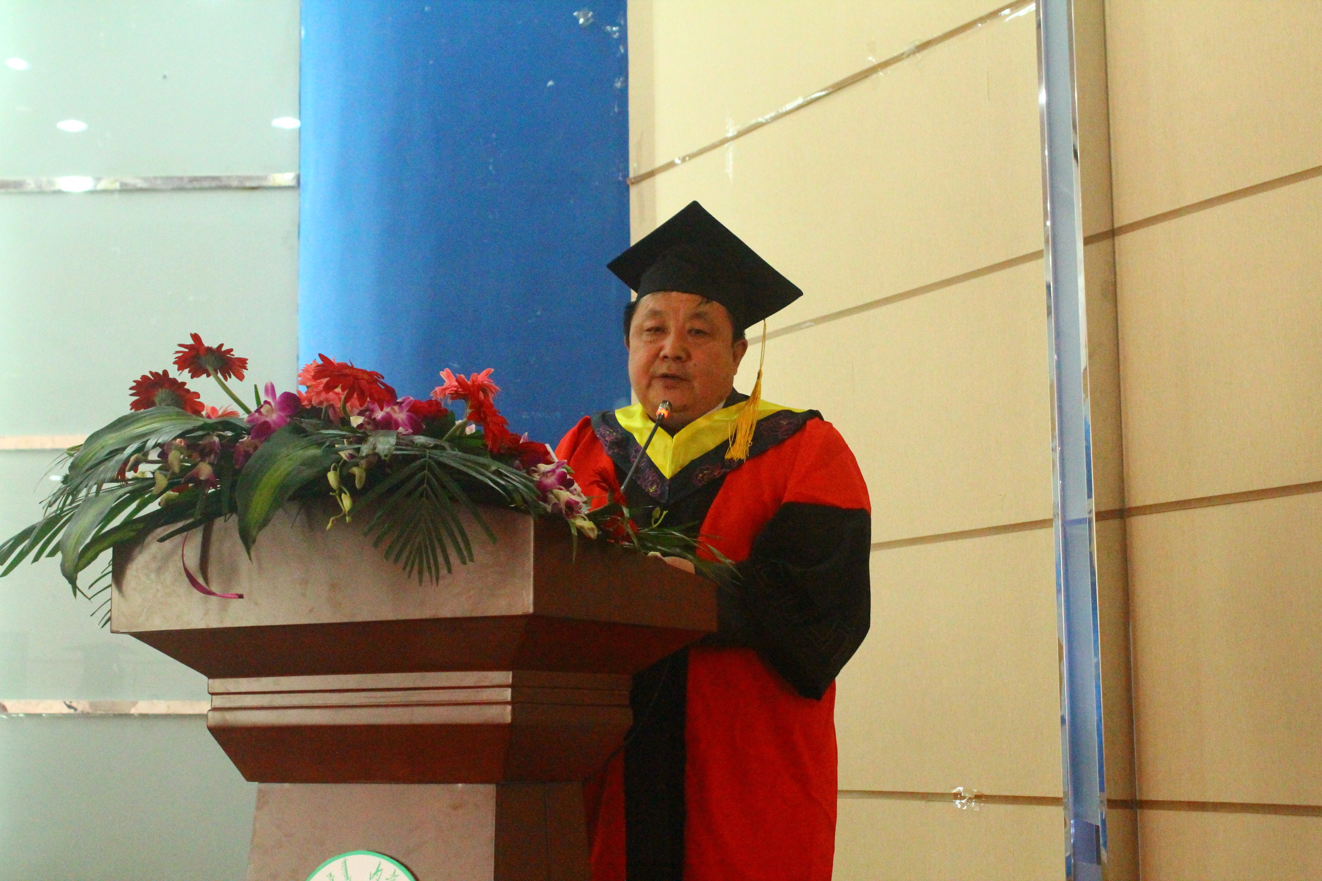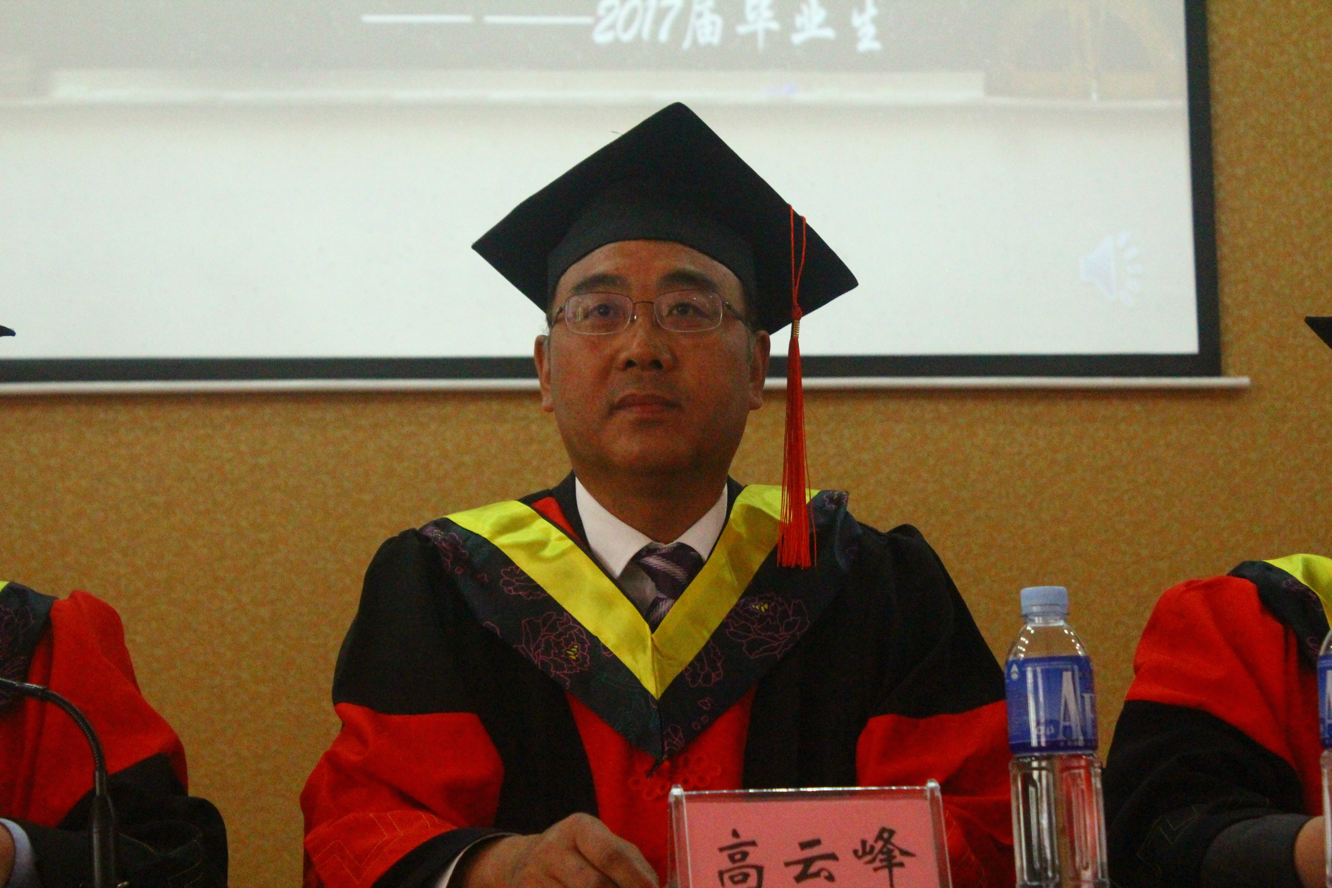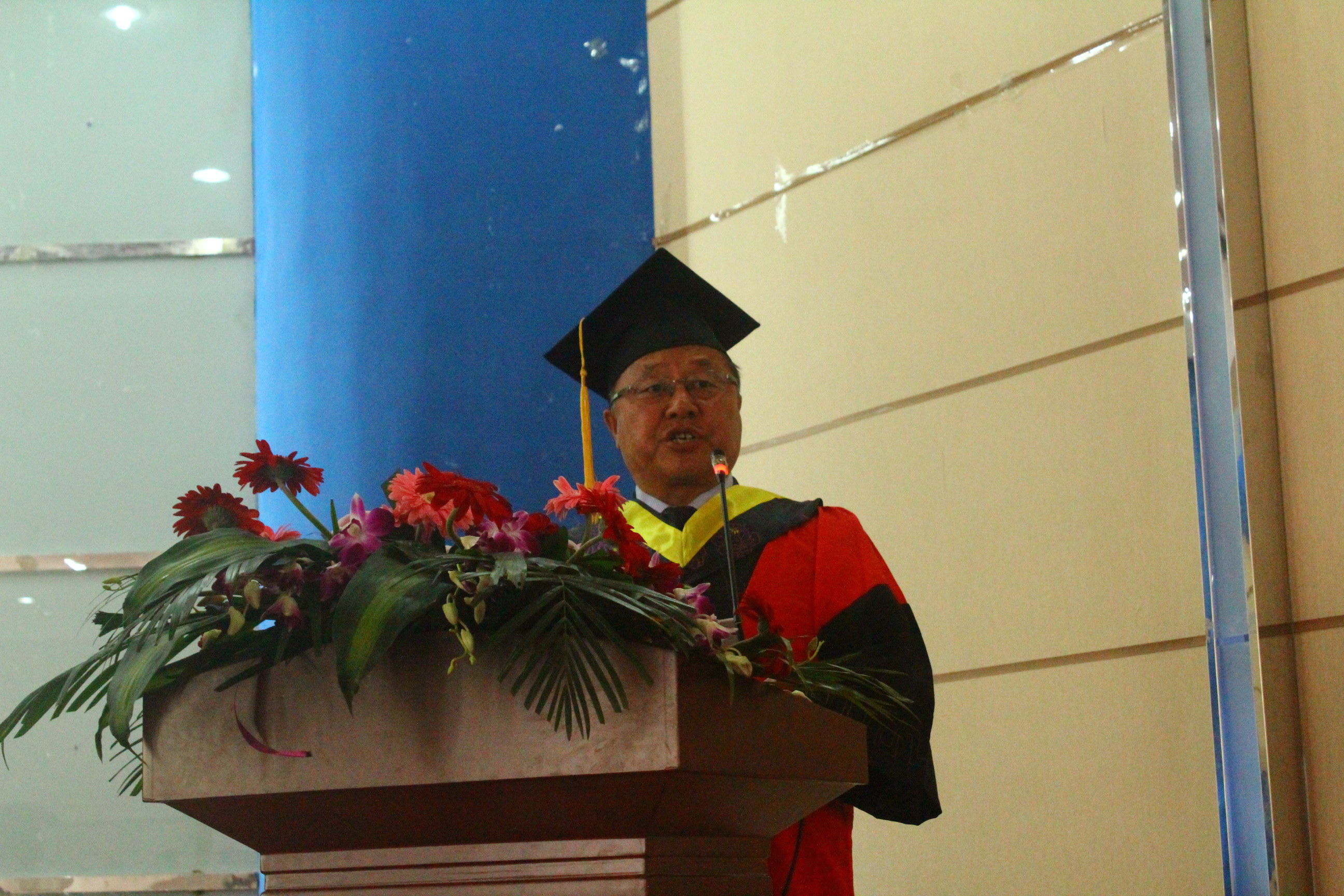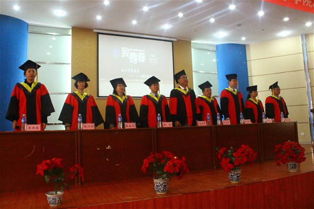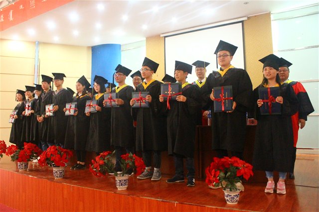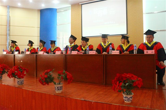 党委副书记、纪委书记高云峰研究员代校领导致辞,并从三个方面给全体毕业生予以嘱咐和期望:1.学习永远没有毕业。求知是光明的旅程,只有起点没有终点,只有通过学习才能紧跟时代的步伐,永远记住淘汰你的是时代而不是你的竞争对手。要让学习成为一种习惯,成为一种精神追求,不仅仅是学习书本上的知识,更应该向他人学习。学会学习,没有学习的艰辛,不会有成功,要时刻记住成功靠学习。2.永不言弃。生活远比我们想象的艰难苦涩,走出校园不仅仅是吃不到了一天25块的饭菜 一年900块的宿舍,更找不到的是那些为你付出的老师和同学们,一切靠我们自己。当我们身临困境时,要告诉自己再坚持一下,阳光总在风雨后,生活的美好要有耐心去等待。3.不要抱怨,无论顺境逆境永远不要抱怨自己的命运,一切都是最好的安排,所有的失败都是为了更好的美好到来腾出地方,所有的低头弯腰都是为高高跃起做准备,所有的破碎都是为了那个来之不易的圆满。他还说:“同学们,母校永远是你们的精神家园,无论何时、无论何地,母校都在注视你前进的脚步、奋斗的身影。作为老师衷心祝愿走出校园的你们依然踌躇满志、依然基情四射、依然心怀梦想,因为有你,母校有更多荣耀时刻被点亮;因为有你,母校有更多美好的故事到处传唱。再见了同学们!一生平安、永远平安,这是老师对你们永远的祝愿!”
