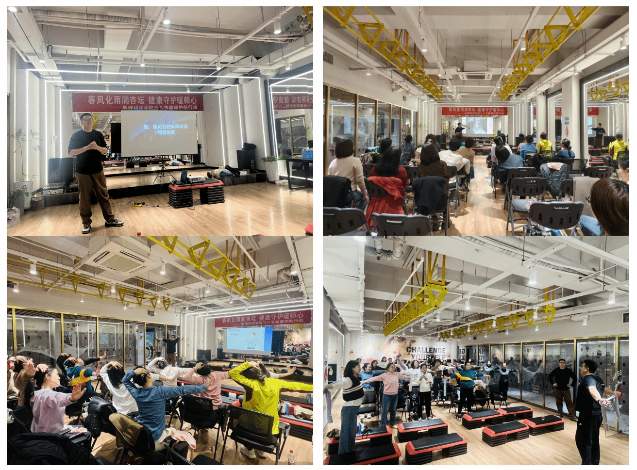 本次活动特邀健身教练和康复科董医生为教师们带来了一场实用的健康知识讲座。活动伊始,健身教练现场演示了肩颈运动的办公室健身技巧,帮助教师们缓解肌肉紧张,预防职业病的发生。随后,董医生详细讲解了教师常见职业病(如颈椎病、腰椎病)的成因及预防方法,并带领教师们进行自查和康复训练,让大家在实践中掌握健康管理技巧。