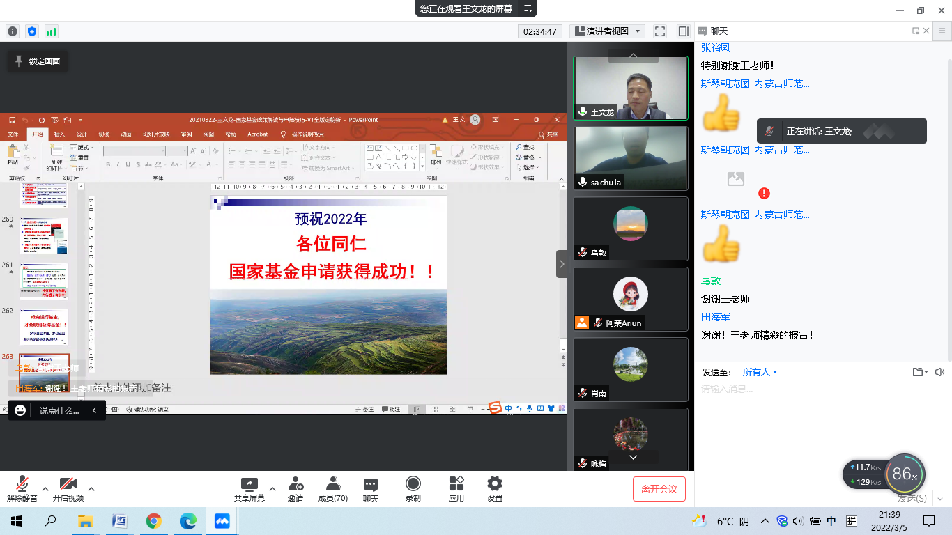 2022年3月5日,beat365正版唯一官方网站邀请了中国科学院水利部水土保持研究所王文龙研究员,为beat365教师分享国家自然科学基金政策的新变化以及申请书的撰写技巧。讲座采用腾讯会议方式进行,由副院长萨楚拉老师主持,书记张裕凤、院长包玉海及近70名老师和博士研究生听取了报告。
