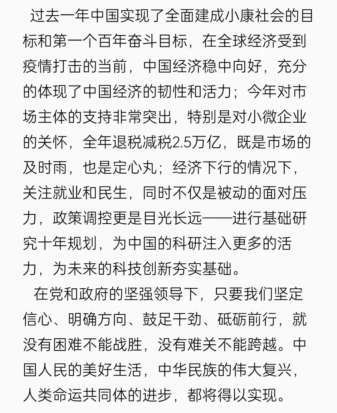 恰逢冬残奥会开幕之际,北京又迎来了“两会”胜利召开的伟大盛事。在期待着运动员们取得辉煌成绩的同时,我也在密切关注着2022年国家的发展规划。当前新冠疫情时有反扑、国际形势也变得错综复杂,我们的前进之路充满着困难与挑战。但是当我看到“两会”代表带着沉着,带着智慧,带着信心,从全国各地相聚北京,共商国是,我的心中备受振奋。我坚定地相信,在习近平总书记的坚强领导下,发挥中国新型政党制度的优势,坚持自我革命的战略思想,2022年我们国家一定能克服各种困难,取得更大的成就。我也相信在不久的时间里,呼市的疫情能够清零,我们也能回到那个心心念念、鸟语花香的校园里,能够与好朋友一起说笑打闹,能够与同学们在那教室里共同学习。当然我们在家上网课,也要努力克服一切困难,就如习近平总书记所讲的那样,不能把吃饭的工具所舍弃。