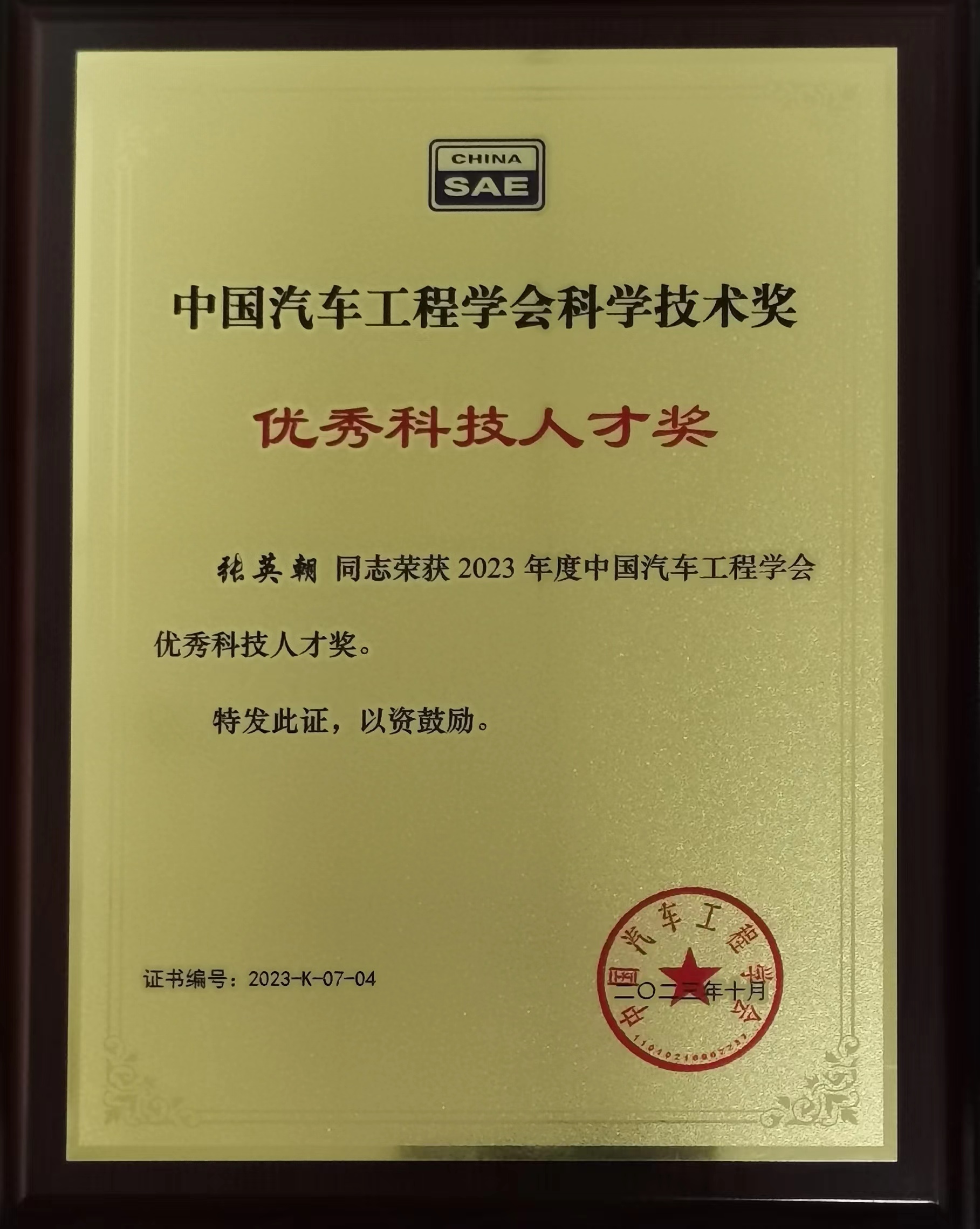 10月25日,2023年度中国汽车工程学会年会及展览会(SAECCE 2023)在北京召开。根据《中国汽车工程学会科学技术奖励办法》规定,经中国汽车工程学会科学技术奖评审委员会评审,中国汽车工程学会科技奖励工作委员会八届四次会议审议通过,授予beat365正版唯一官方网站张英朝教授“2023年度中国汽车工程学会优秀科技人才奖”。在本次年会上,学会为张英朝教授颁发了获奖证书和奖牌。