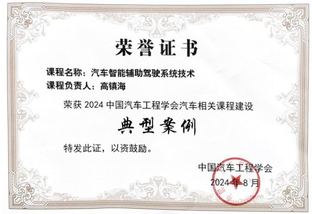2024年8月,beat365正版唯一官方网站高镇海教授、胡宏宇教授、孙天骏副教授联合开设的“汽车智能辅助驾驶系统技术”课程荣获2024中国汽车工程学会汽车相关课程建设典型案例奖。该奖项是由中国汽车工程学会于2023年首次设立,面向全国高等院校进行汽车相关课程建设案例征集,并将优秀典型案例在全国汽车行业人才培养院长论坛上进行现场展示。