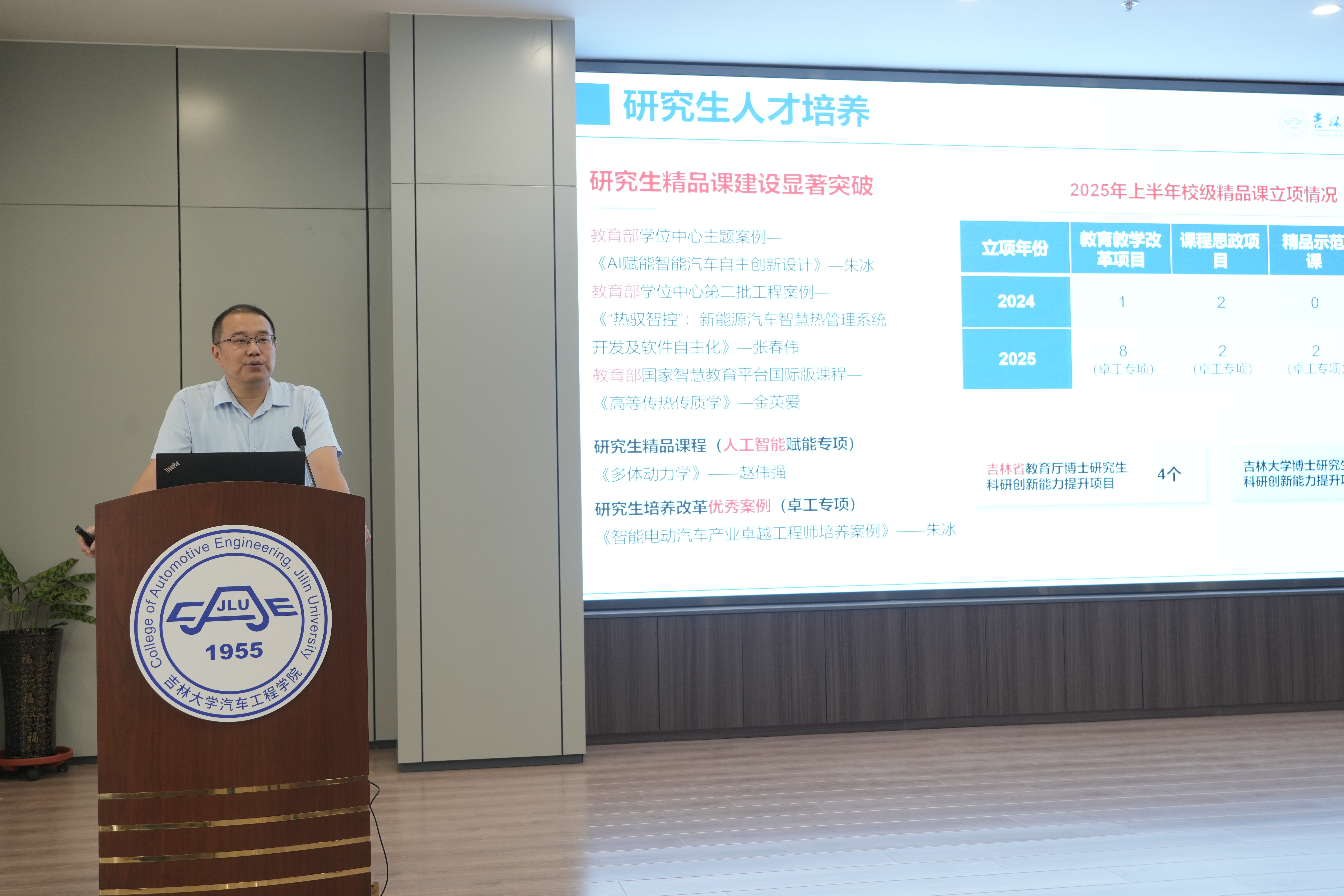 院长朱冰从党建工作、队伍建设、人才培养、学科建设、科研与实验室管理、学生工作、校友工作、国际合作以及行政管理等多个方面,系统总结了上半年学院取得的显著成绩,并立足“数智汽车时代,吉大汽车何为”这一命题,对新学期重点工作进行了周密部署。针对年度核心任务——学科70周年庆典,朱冰详细介绍了系列庆祝活动安排,强调“院庆不仅是‘庆生’,更是‘凝心聚力’”。他呼吁全体教师以主人翁姿态积极投身于宣传动员、环境美化、校友联络与捐赠对接等工作中,共同努力打造一场有战略高度,有人文关怀,有思想深度的庆典,让“吉大汽车人”的声音传得更远、更响。