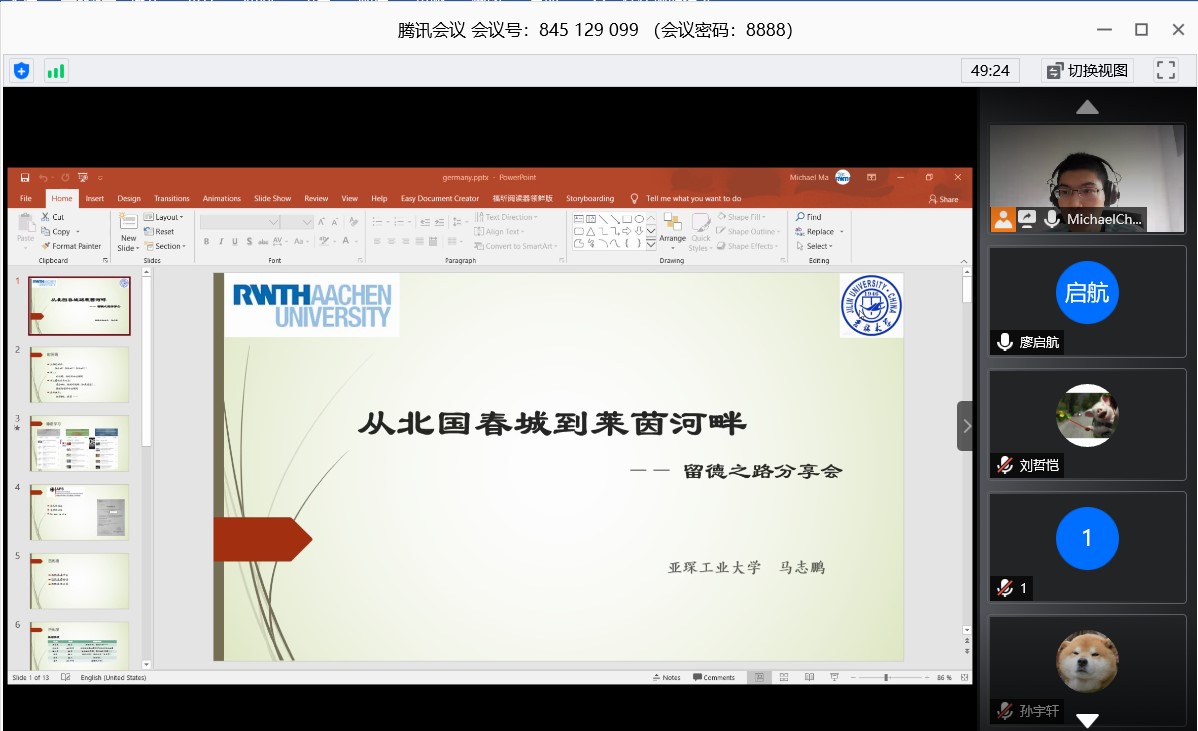 本次活动采用线上形式进行,马志鹏从如何申请去德国留学和关于在德国生活分享两个方面进行讲解。关于如何申请去德国,他介绍了对于德语的学习,强调德语学习要坚持,不能因为学校考试周就一个月不学德语,这样会导致之前的学习成果前功尽弃,并且德语对于在德国的生活十分重要,讲解了关于APS审核以及匹配度的要求。由于匹配度是申请德国学校时独有的要求,着重讲解了我们对标德国工科在各个大类所差的学分。