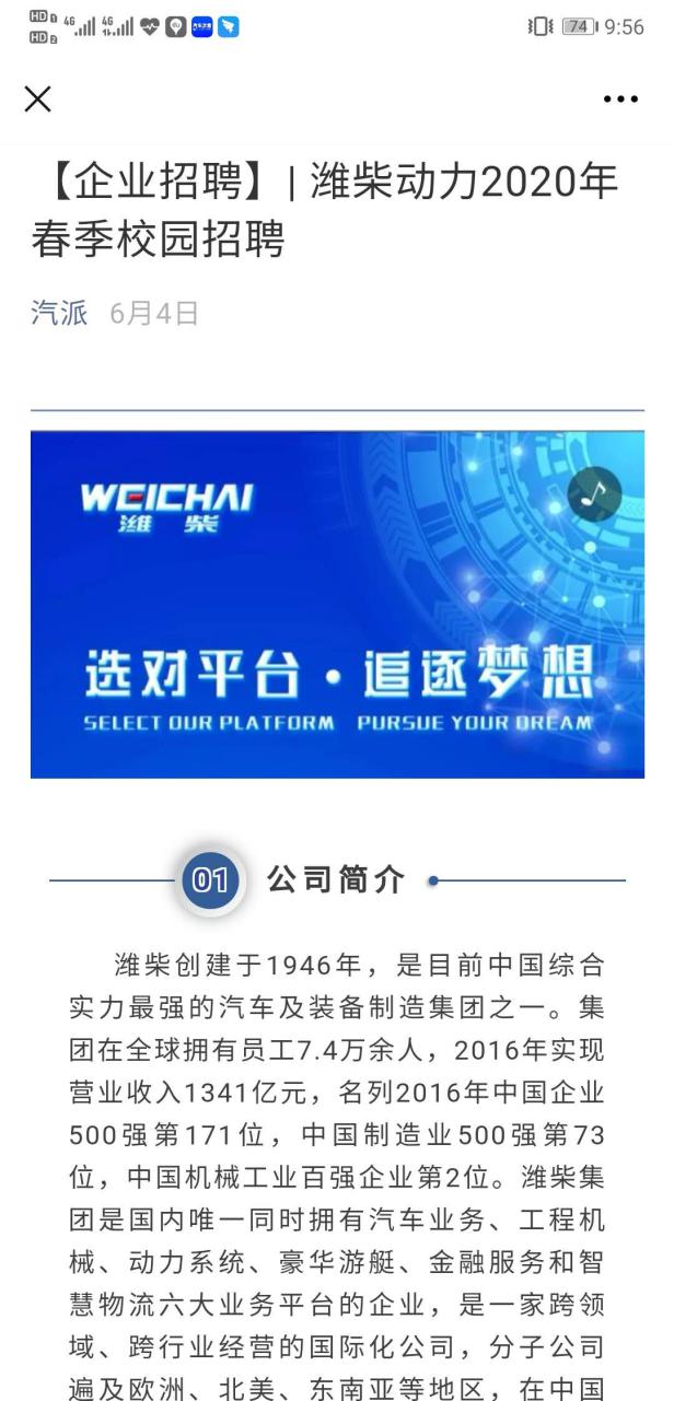 提供招聘/实习岗位,充实工作实践经验。以学院为平台,和社会、企业资源整合,为学生提供实习实践机会,提升学生实际工作能力,体验工作氛围。充分利用beat365正版唯一官方网站官方公众号——汽派,发布潍柴、宇通重工等各企业招聘信息,多渠道为学生提供就业、实习平台,让学生“大有可为”。